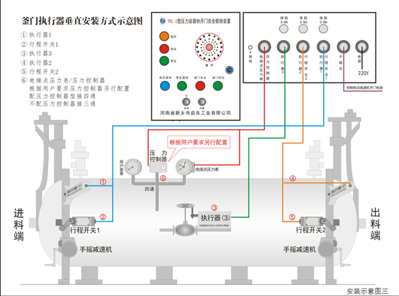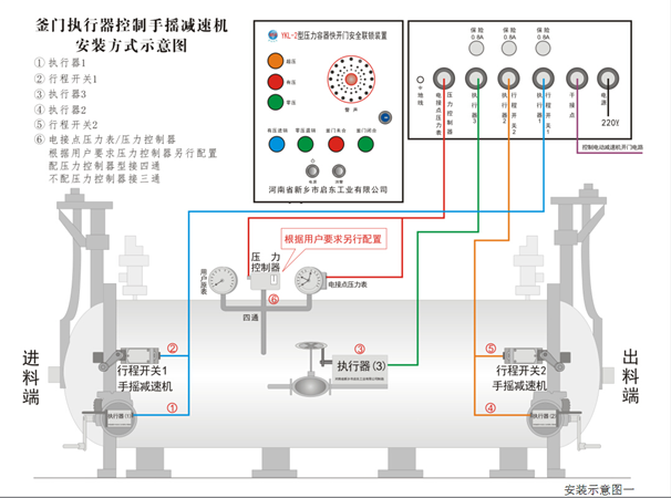 1.將主控箱安裝在便于觀察操作、防水防雨的地方,接通AC220V電源。將三通(壓力控制需配四通)安裝在進(jìn)料端釜門上部原壓力表處。