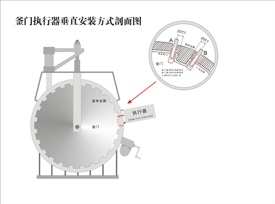 2.3.2.將壓力容器的快開門裝置關(guān)好,使其處于鎖緊閉合到位,確認(rèn)鎖緊及開啟方向,按《安全聯(lián)鎖裝置安裝圖》規(guī)定,在外齒圈鎖緊時(shí)的前進(jìn)方向,距殼體內(nèi)齒圈前端20±1mm在齒圈上畫安全銷孔橫中心線,兩點(diǎn)交叉處為銷孔圓心。